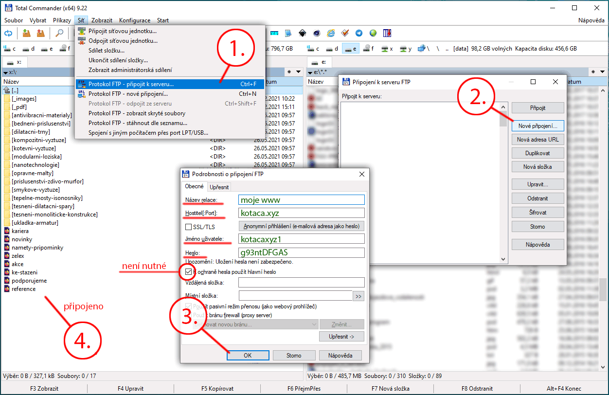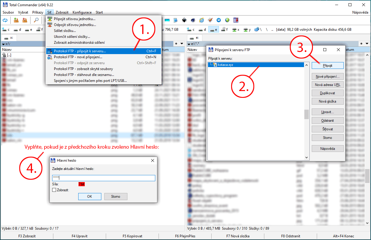 - "Síť › Protokol FTP - připojit k serveru..." (klávesová zkratka CTRL+F)