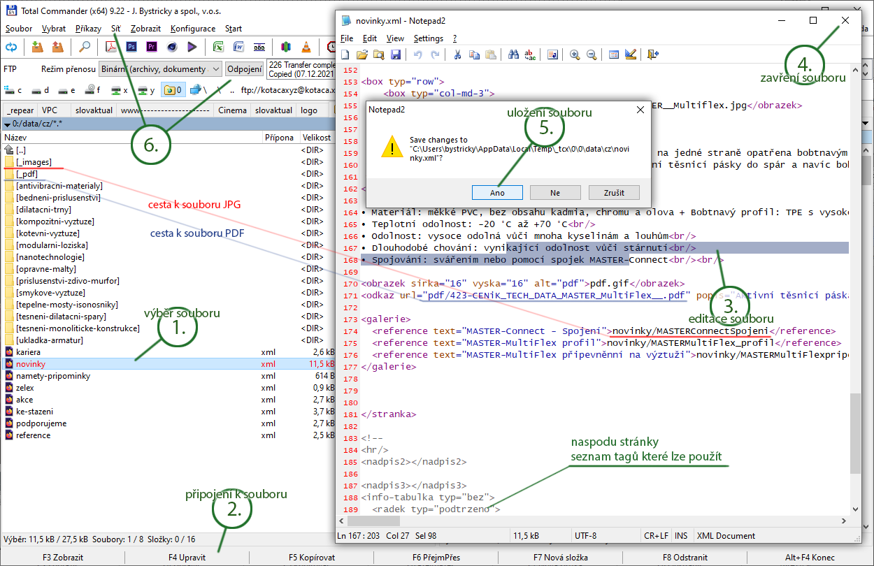 - Editovaný soubor můžeme nejprve nahrát k sobě na disk a úpravy udělat až zde (dokument XML je choulostivý na chyby nebo překlepy v jeho struktuře značek/tagů).