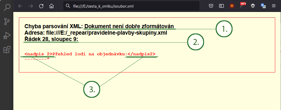 - Pokud je v souboru chyba ➂, prohlížeč vás na ni upozorní ➀ ➁ - viz obrázek.